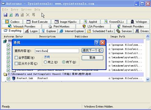1、運行autoruns軟件,在everything里面是用快捷鍵ctrl+f搜索veriface。(如圖)