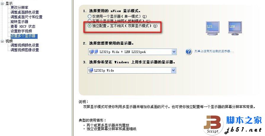 在 NVIDIA 控制面板中也可以看到多了一個選項“獨立配置 互不相關(雙屏顯示模式)”,如下圖: