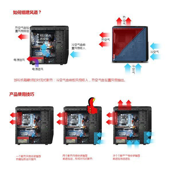 總的來說,機箱電源風扇安裝與連接是比較簡單的,對于風扇安裝,一般需要注意機箱風道,讓機箱內部散熱風扇做到更好的散熱優(yōu)化,如下圖所示。
