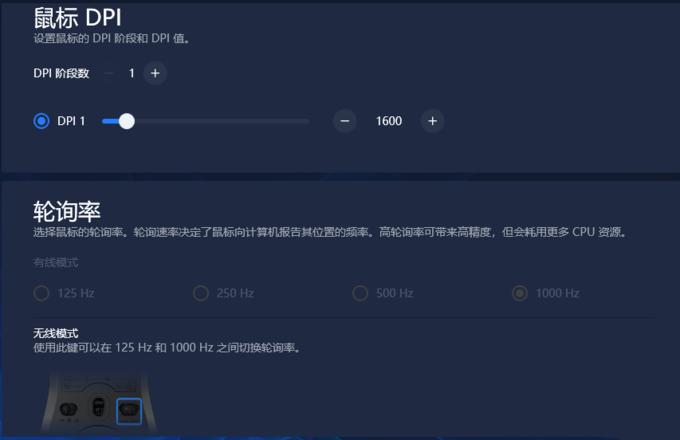 DPI最高支持5檔調節,調節最小以100為單位。在有線模式下能夠調節鼠標的輪詢率。