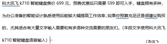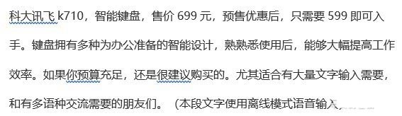 自科大訊飛智能鍵盤K710到手起,已經過去了四五天。筆者從不好意思出聲使用,到對于這把鍵盤愛不釋手的改變。訊飛智能鍵盤的語音輸入功能的確可以極大的提高生產工作效率。是我等職場人士的好幫手。