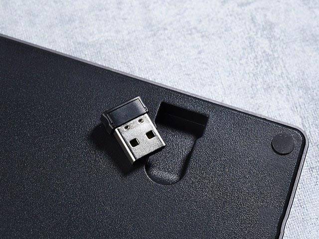 鍵盤上方分布了電源開關、Type-C充電口以及一片跑道形的黑色光滑的平面,這個位置是鍵盤的天線開槽。畢竟,鋁合金外殼會產生很好的屏蔽效果,而鍵盤的連接則依靠藍牙以及2.4GHz接收器兩種方式完成。接收器被磁吸放置在鍵盤背面,牢固易取。