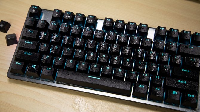 軸體的話,雷柏自主的紅外銀軸采用純紅外光阻斷式導通原理,型號的傳輸更為穩定,同時這樣的結構,讓這款機械鍵盤無懼水的侵擾,即便是在水中,也能夠正常的進行工作。