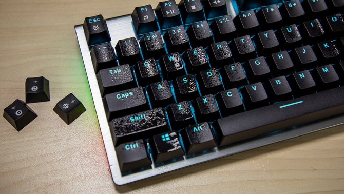 鍵盤的正面蓋板采用了整塊的金屬合金,并且經過了金屬拉絲處理,視覺感受上非常不錯的,還有就是鍵盤按鍵采用了懸浮式設計,十分酷炫。