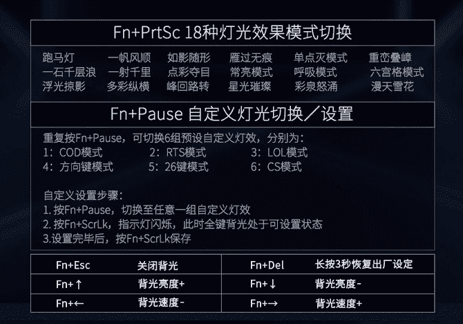 除此之外,作為一款針對電競玩家的機械鍵盤,光效當然也是必不可少的了,這款機械鍵盤擁有冰藍單色背光系統,并且有18中預設光效,很多的玩法,讓我們擁有更多的使用樂趣。