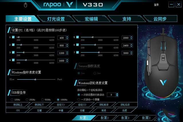 在驅動中,我們可以設置鼠標的指針速度、按鍵功能、燈光效果、宏按鍵等等。同時還可以注冊并登陸賬號,對設置進行云同步。