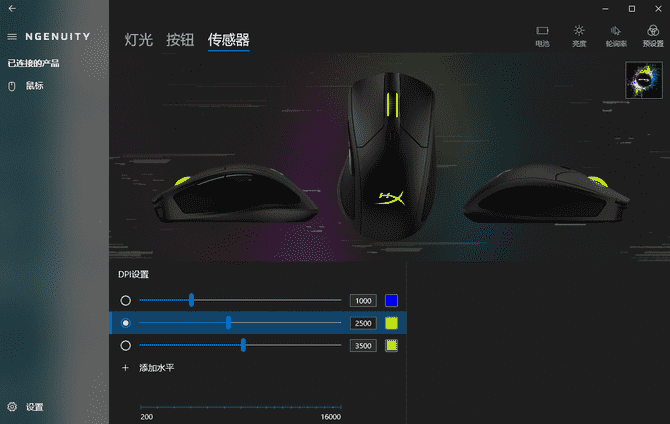 HyperX NGENUITY驅動已經支持多款HyperX產品,鍵鼠外設都可通過一個驅動進行設定,驅動共分為燈光、按鍵、傳感器三大部分,界面清爽、高效。頂部則能查看鼠標電量,以及調整亮度、回報率等參數。