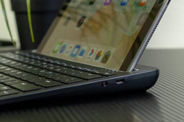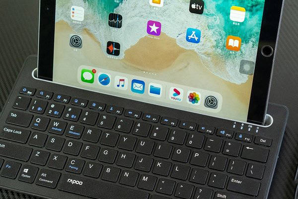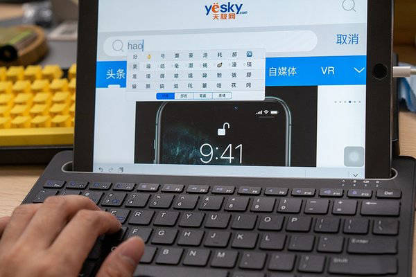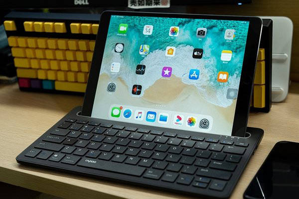 筆者用10.5英寸iPadPro搭配雷柏XK100使用,只需將iPadPro放置在鍵盤頂部的插槽上,鍵盤即可實現支架的作用。作為支架的雷柏XK100很好的契合了10.5英寸iPadPro,既不會對屏幕造成遮擋,接近110度的傾斜角度提供舒適的視覺體驗。