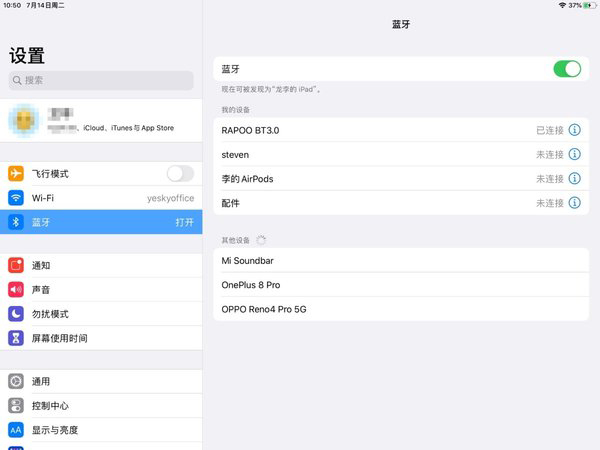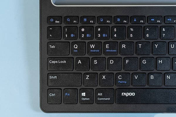 連接方面,在開啟iPadPro藍牙功能之后,在設備商配對名稱為“RAPOOBT3.0”,即可實現配對。雷柏鍵盤的開啟方法則是打開右側邊框上的開關后,通過Fn+C(鍵帽“Pairing”)開啟鍵盤的配對模式,點擊連接即可完成配對。