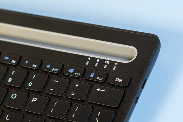 雷柏XK100藍牙鍵盤正面頂部是一個凹槽,凹槽的長度大約26cm,寬度大約1.3cm,可以長度25cm的平板電腦放置,可支持除了12.9英寸iPad Pro之外的所有iPad。將凹槽當作支架使用的屏幕有110°左右的仰角。淺灰色的凹槽采用高強度的工程塑料,保證平板電腦使用時的穩定性。凹槽右下角則是四顆并排的狀態指示燈,用于顯示大小寫、藍牙狀態、電量及電源狀態等。