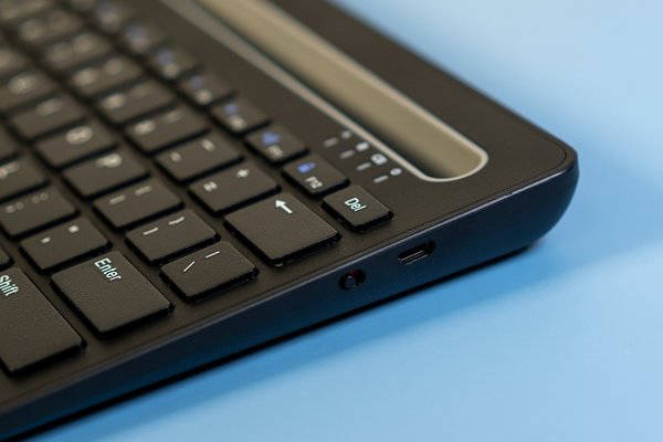 雷柏XK100藍牙鍵盤擁有前高后低的小角度傾斜,用戶在使用鍵盤輸入時的手感舒適。鍵盤右側邊框則是鍵盤的撥動開關、Micro-USB充電接口。雷柏XK100鍵盤內置280mAh電池,配合內置的自動休眠技術,可為鍵盤提供最長93小時續航時間。