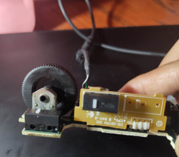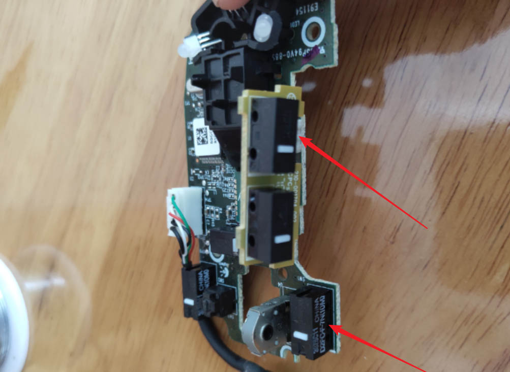 6、電路板取出后檢查左鍵觸發(fā)裝置,發(fā)現(xiàn)其彈力和右鍵有所不同,估計是內(nèi)部的彈片疲勞了;拆開也沒有彈片更換,怎么辦?