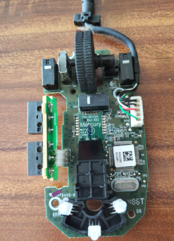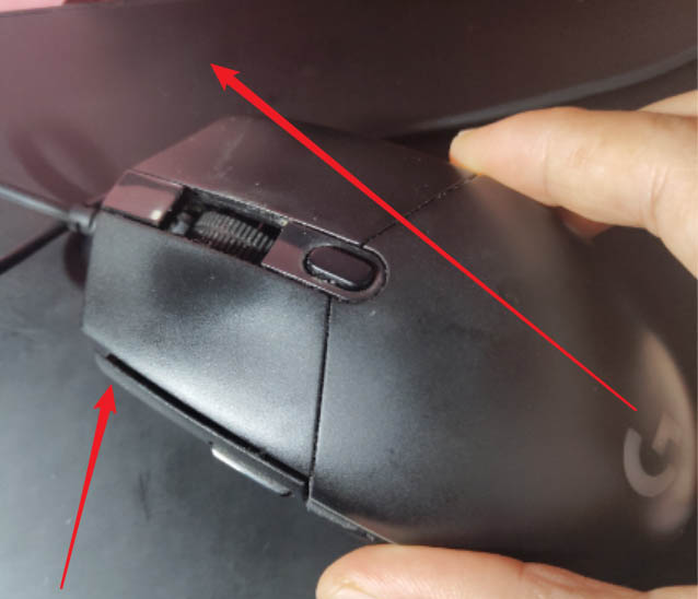 7、這個型號的鼠標有二個側(cè)鍵,這二個側(cè)鍵從來沒用過;直接將其中的一個側(cè)鍵用鉻鐵取出,焊到到左鍵上。將鼠標裝好。連接電腦,鼠標能正常點擊了。這種方法也可以用到其它型號的鼠標上,不過要有相同的觸發(fā)裝置可以代換。