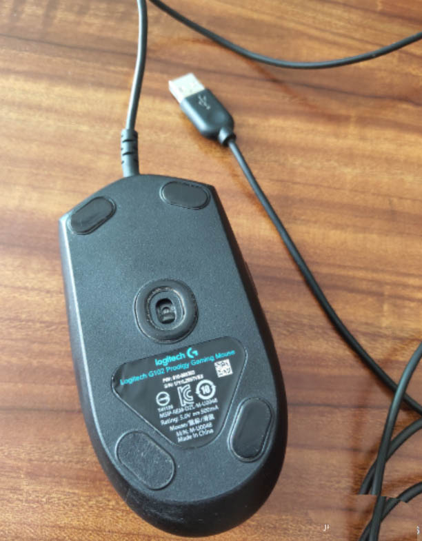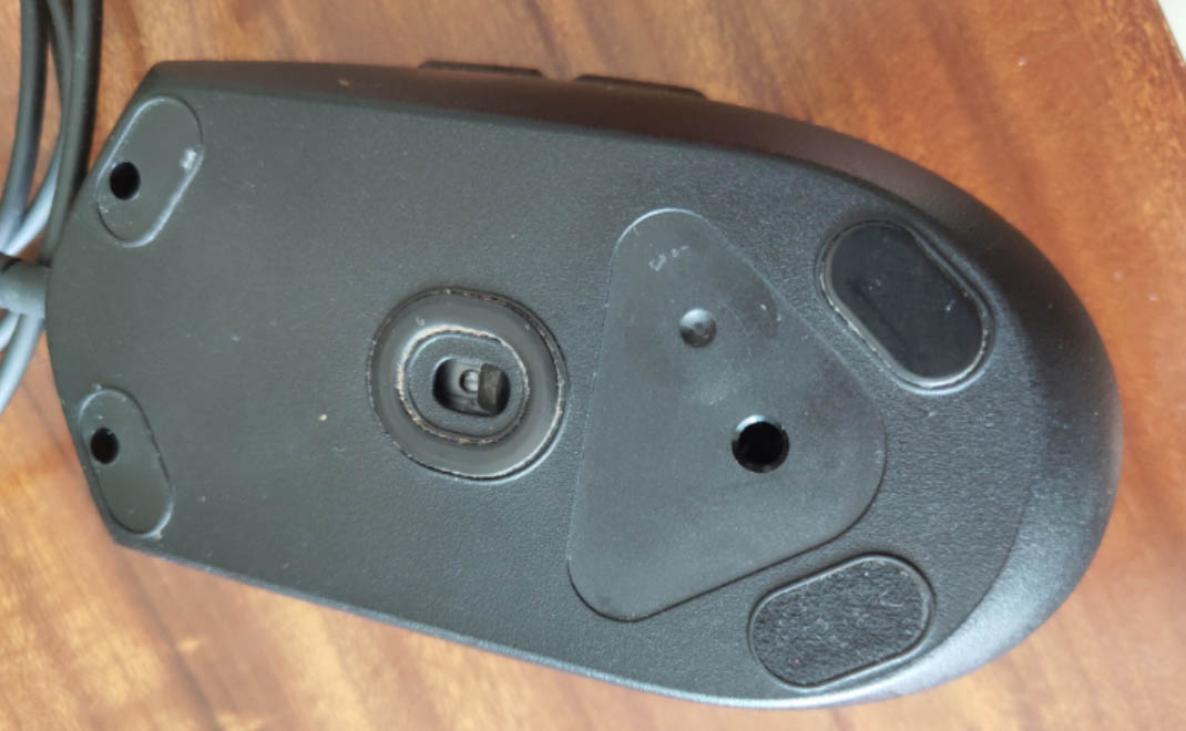2、鼠標一般都是從底部加上螺絲來實現(xiàn)裝配,這個型號的鼠標也不例外;底部有四個貼了硬膠片的墊腳和帖有LOGO的標識,如圖所示。