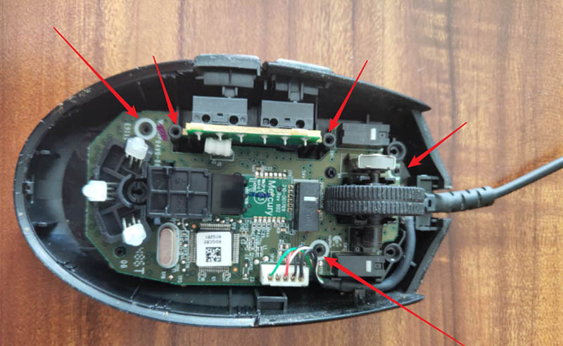 5、取開頂蓋后就可以看到鼠標的內(nèi)部結(jié)構(gòu)了,要將其中的電路板取出還要松開5顆螺絲,位置在圖2紅箭頭所示。
