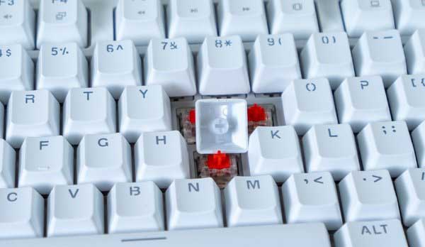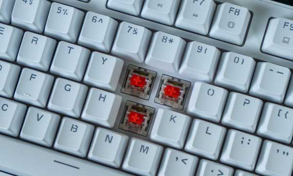雷柏MT710機械鍵盤使用雷柏自主研發的機械軸體,提供黑、青、紅、茶4種軸體供用戶選擇,筆者收到的則是紅軸版本。采用透明軸蓋+十字柱設計;2.0mm的觸發行程、45cN觸發壓力,實際手感非常接近原廠CHEERY軸,理論壽命高達6000萬次。