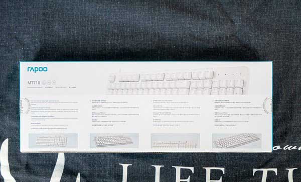 雷柏MT710辦公機械鍵盤采用瓦楞紙的外包裝盒,包裝風格延續了雷柏家族式的撞色設計,純白色的正面、底面和四周淺藍的配色方案,在視覺上相當簡潔、清爽。