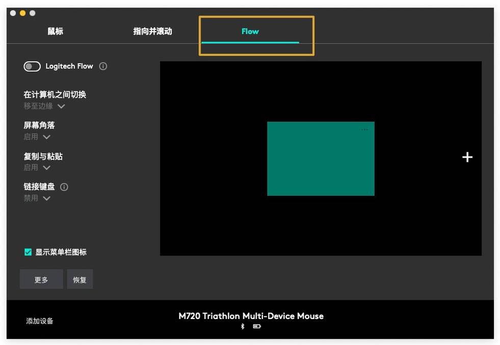 5、最后我們看第三個標簽——Flow。這個功能是可以在同一局域網內,鼠標自由在兩臺設備間移動,可以共用黏貼板。只要開啟Logitech Flow按鈕。