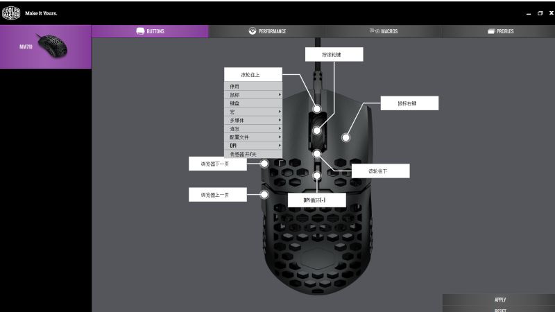 天狼星鼠標有專門的驅動軟件,軟件包含四大部分,首先第一塊是自定義按鍵。鼠標上除了左鍵都能自定義功能,而且每個按鍵都能設定成DPI的調節鍵或者鍵盤的快捷鍵,FPS玩家比較喜歡的連發功能也有,完全可以按照玩家喜好來,不必拘束于原廠設定。