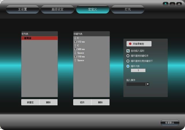 點(diǎn)擊界面開始錄制宏,并依次輸入C和空格,點(diǎn)擊"停止錄制"并保存,即完成了一組宏命令設(shè)置。然后轉(zhuǎn)到主設(shè)置頁面選擇一個(gè)按鍵,點(diǎn)擊按鍵設(shè)計(jì)并選中“宏定義”,在宏列表中選中剛才設(shè)置的宏,再點(diǎn)擊確定,就完成了設(shè)置。設(shè)置完成后,就可以開啟一鍵跳窗功能了,從此游戲操作將會(huì)提升一個(gè)臺階。