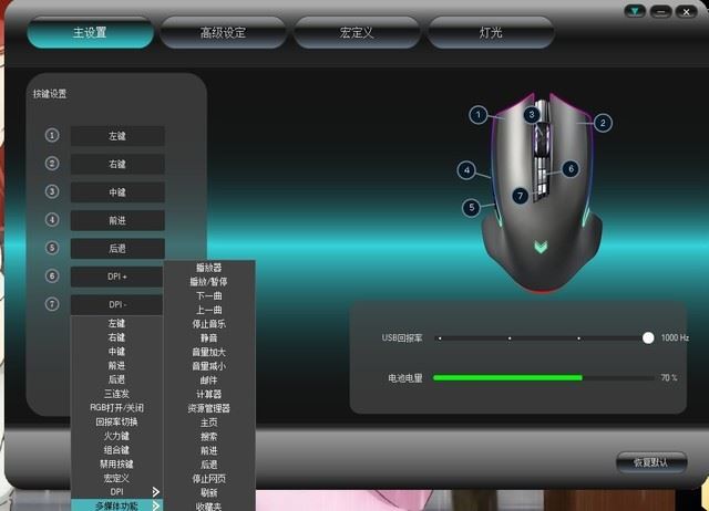 驅(qū)動(dòng)中的主設(shè)置提供7個(gè)主按鍵的自定義功能, 除了常規(guī)的定義外,雷柏還支持三連發(fā)、RGB打開/關(guān)閉、回報(bào)率切換、火力鍵、組合鍵/禁用按鍵和宏定義外,還可選DPI調(diào)節(jié)和多媒體功能(計(jì)算器、播放器、郵件、資源管理器、網(wǎng)頁的刷新、搜索等)。頁面右下方則是四檔最高1000Hz、最低125Hz的USB回報(bào)率設(shè)置。同時(shí)可以看到,電池電量也會(huì)在該頁面顯示。