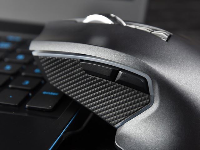 雷柏在鼠標(biāo)兩側(cè)配備了加厚一體式成型點(diǎn)狀紋理防滑側(cè)裙,材質(zhì)是橡膠,嚴(yán)絲合縫的與各部件相連接,表面為點(diǎn)狀紋理,能夠有效增加摩擦力,從而提升操控的穩(wěn)定性。在右側(cè)裙擁有一長一短兩個(gè)自定義按鍵,可以看出這款鼠標(biāo)依然更偏向于右手用戶。