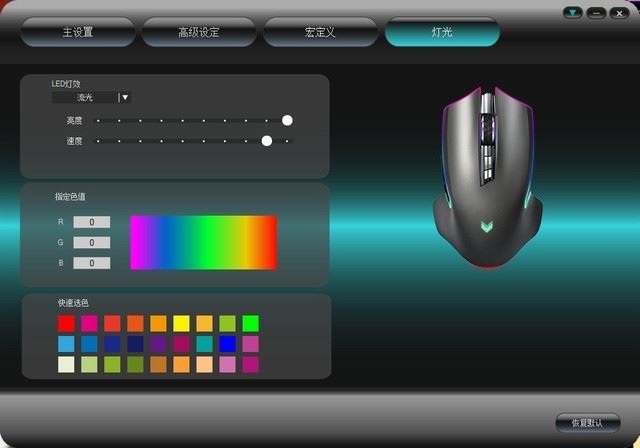 燈光也是這款鼠標(biāo)的亮點(diǎn)之一。在驅(qū)動(dòng)的燈光設(shè)置中,我們可以將LED燈效設(shè)置為常亮、呼吸、流光、關(guān)閉四種狀態(tài),并可調(diào)節(jié)燈光的亮度和變換速度。同時(shí)我們還可以自行指定色值,將R(RED)、G(GREEN)、B(BLUE)分別輸入0~255之間的數(shù)值。還有快速選色功能,有30種已經(jīng)設(shè)置好的顏色可供直接使用。比較遺憾的就是不能設(shè)置感應(yīng)模式自主感應(yīng)人手接近。