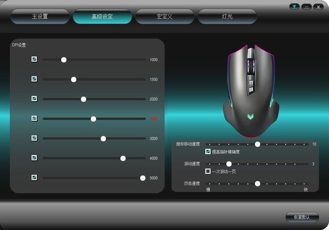 這款鼠標(biāo)采用了原生PMW3325專業(yè)游戲傳感器能滿足絕大部分游戲玩家的需求。在主頁面中的高級設(shè)定中,可以調(diào)節(jié)各個(gè)檔次的DPI數(shù)值,一共有7個(gè)檔次,最低200,最高5000。還可以設(shè)置鼠標(biāo)移動(dòng)速度、滾動(dòng)速度、雙擊速度的快慢,并決定是否選中“提高指針精確度”和“一次滾動(dòng)一頁”。