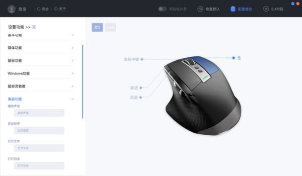 在高級模式下,包含一些高級功能,包括播放音樂、啟動程序、打開文件、打開目錄等功能,用戶均可通過雷柏官方驅動程序一鍵設置。