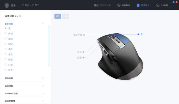 雷柏MT750S還帶了非常完善的驅動,相比游戲系列,MT辦公系列的驅動界面更加簡潔。主界面右側為雷柏MT750S鼠標圖示,左側則是具體的設置功能區域。用戶需要點擊右側鼠標圖示中的響應按鍵,左側會彈出對應的功能控制選項,比如右鍵可以設置剪切、復制、粘貼、查找、全選、新建、打印、保存等功能,其他按鍵均可設置對應的多功能按鍵,但左鍵并不支持調節。