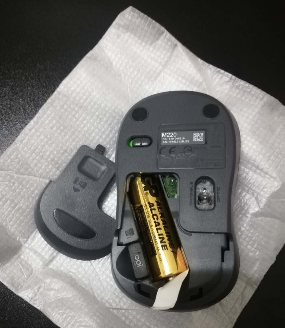 6、現(xiàn)在來打開鼠標(biāo)的后蓋,打開后發(fā)現(xiàn)里面裝著一顆電池,而之前的這個老鼠尾巴就墊在電池的一端,防止跑電。說明這個鼠標(biāo)包裝設(shè)計者還是很用心在設(shè)計的,這些小細(xì)節(jié)不僅考慮到了,而且做得還很漂亮。