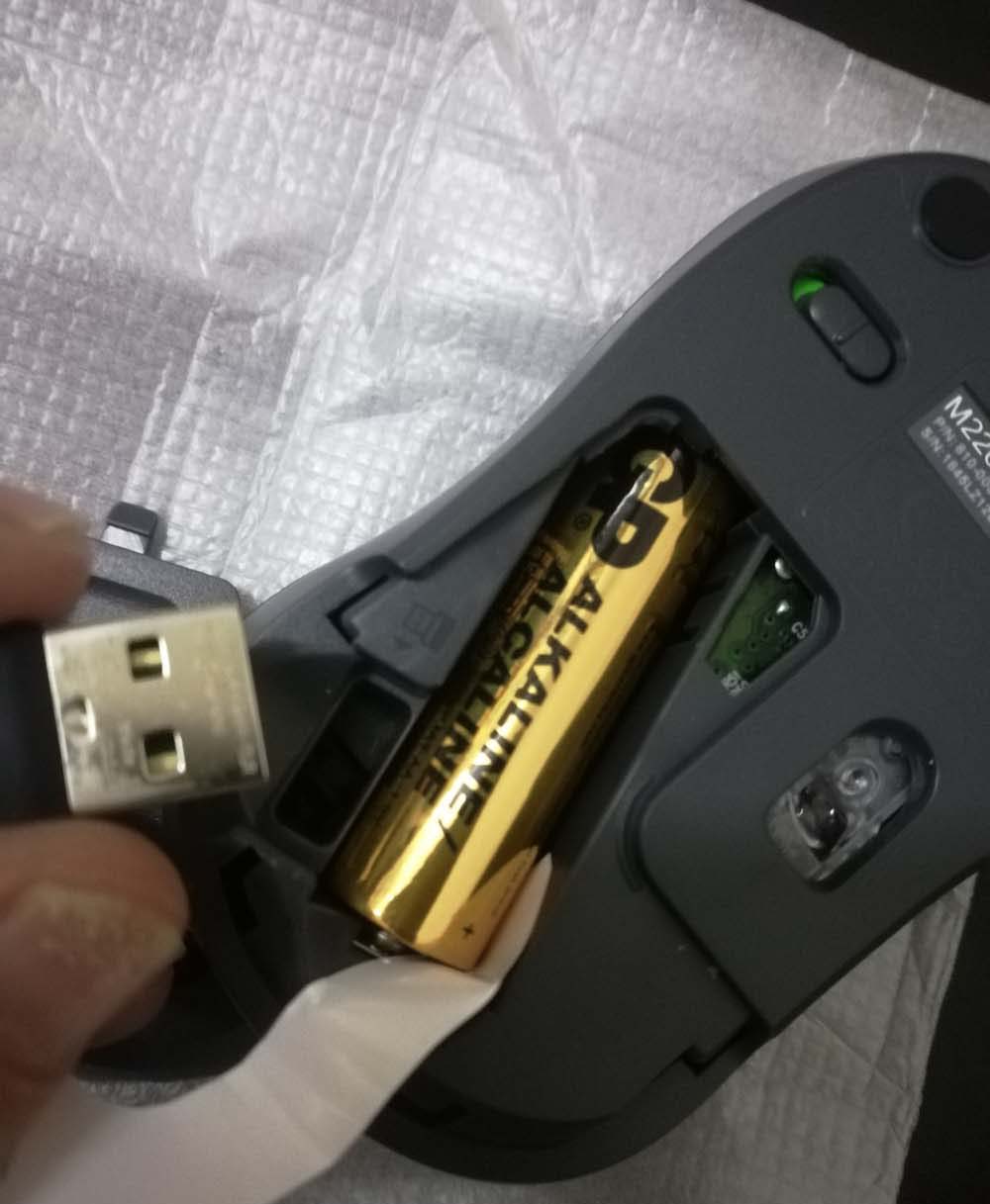 7、電池槽的旁邊是鼠標(biāo)信號接受器,將其扣下開插到電腦的USB口便可使用,使用完后再插回去,非常容易收納。