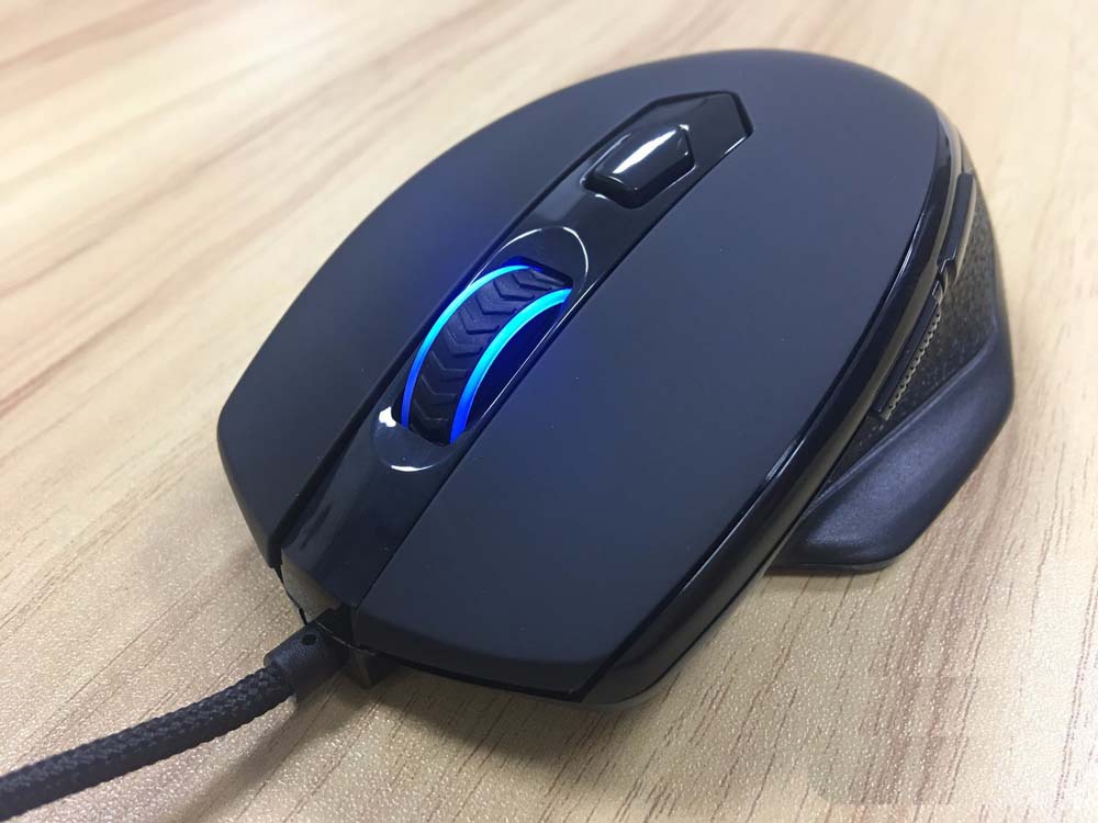 1、小編拿到的樣品鼠標,整體呈現黑色外觀材質使用類肌膚材質,鼠標上面有2條ABS塑料邊帶,有一定的反光看著比較多帥氣,而后面的圖標和滾輪均可發光。鼠標是曲面外形設計,偏向于扁平化符合人工學設計,用久了手也不累。