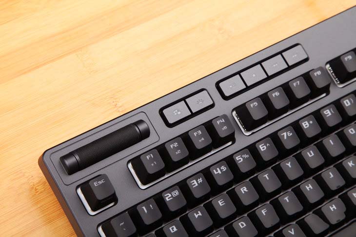鍵盤的左上側布置了一個寬大的橡膠材質的音量調節滾輪,阻尼適中,滾動順暢,可以通過前后滾動來調解設備音量。