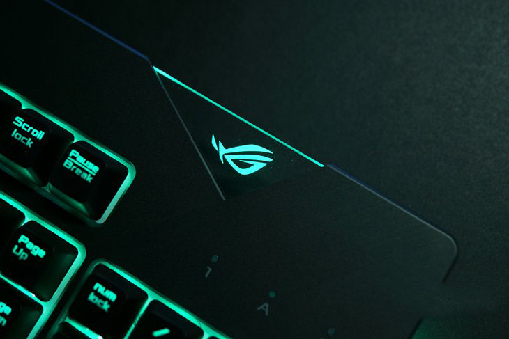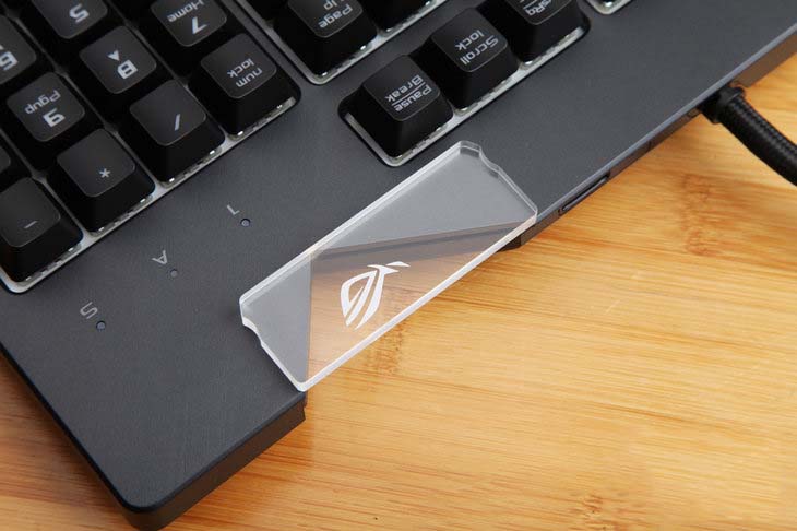 右上角的“敗家之眼”是一塊透明亞克力片,可以拆卸,ROG隨盒附贈了一塊空白的透明亞克力片,支持玩家自定義圖案,充分將自主權下放給玩家,可以更加個性化的對鍵盤進行自定義。