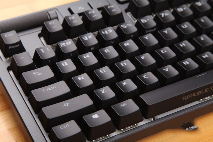 ROG STRIX FLARE機械鍵盤采用了104鍵的全尺寸鍵盤設計,“拉絲+微磨砂”的設計使用起來手感舒適。鍵盤三圍尺寸為:454 mm x 155 mm x 31 mm,重量僅為1256g,對比其他機械硬盤,重量上略輕一些。