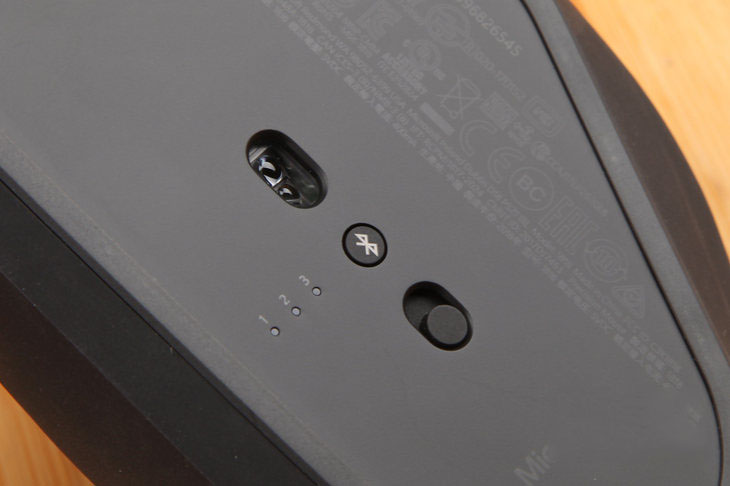 鼠標底部沿用了磨砂黑色的設計,底部一圈是鼠標的腳墊,鼠標中部是鼠標的主要功能區,集中了引擎窗口、藍牙按鍵以及指示燈還有鼠標的開關。