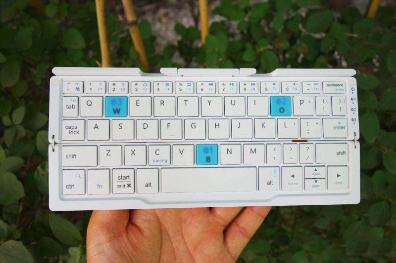 千呼萬呼始出來,從上向下翻折一下,我們就能看到這款超級便攜的航世HB199的廬山真面目了。鍵盤的格局是采用標準的鍵盤格局,鍵盤的按鍵上做了很多天空藍的標注,其中最引人注目的是WOB這三枚按鍵,它們三者使用了天空藍的按鍵鍵鈕,為何選擇它們三呢?組合一下,B.O.W 航世 ,其實就是航世品牌的英文簡稱。