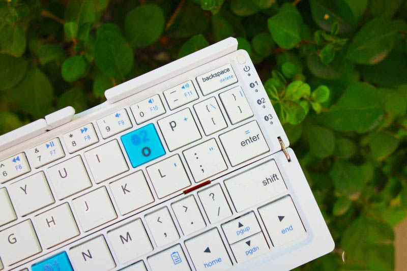 別小看這款藍牙鍵盤,古語有云:麻雀雖小五臟俱全。這款B.O.W 航世 HB199 折疊藍牙鍵盤的按鍵材質是ABS的,每一粒按鍵在敲擊的時候,給手指的反饋是非常輕柔的,就像巧克力鍵盤一樣。我們再來細看一下鍵盤的每一個按鍵上面藍色的多功能標注,多功能快捷按鍵可以說給了鍵盤給多的命令,這讓我們在外出辦公時,不至于嫌鍵盤小,而缺失了很多的功能鍵。在鍵盤的右頂端,從上至下依次是電源指示燈,藍牙123指示燈,燈小而不刺眼。