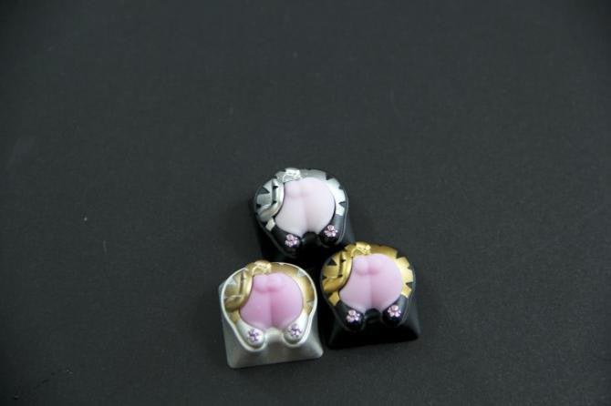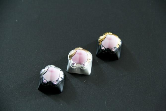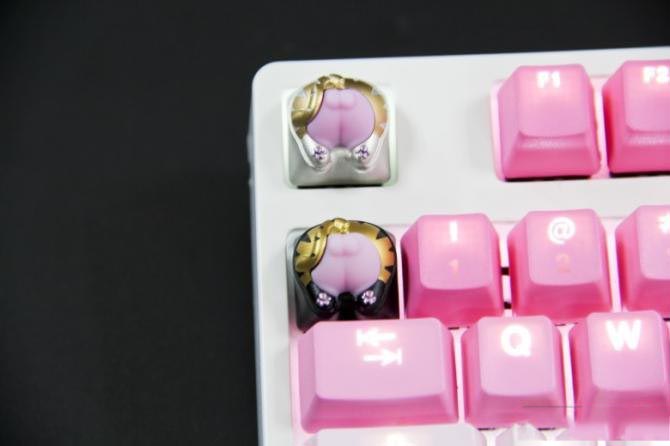 貓屁屁變色金屬鍵帽共有三款,兩個鍵帽本體是黑色,貓屁屁顏色為黑+銀和黑+金,一個鍵帽本體是銀色,貓屁屁顏色為銀+金。貓爪依然是熟悉的粉色,繼承了貓爪鍵帽的精髓。鍵帽整體上都是金屬材質,但是貓屁屁可是采用了軟膠材質,并且將貓蛋蛋也做的惟妙惟肖,按上去會告訴你什么叫做真正的“Q彈”。