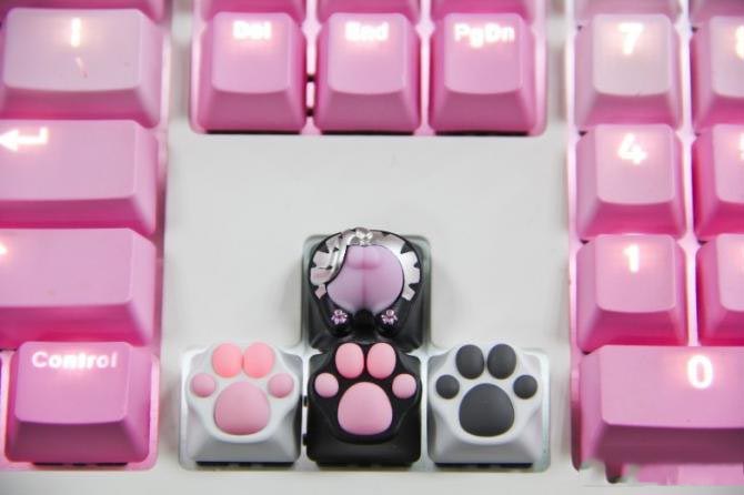 貓屁屁變色鍵帽和貓爪鍵帽的高度幾乎一樣,雖然是異形鍵帽,但是長寬也和普通鍵帽一樣,不會對旁邊的按鍵造成干擾,就算放在常用按鍵上也沒有關系。
