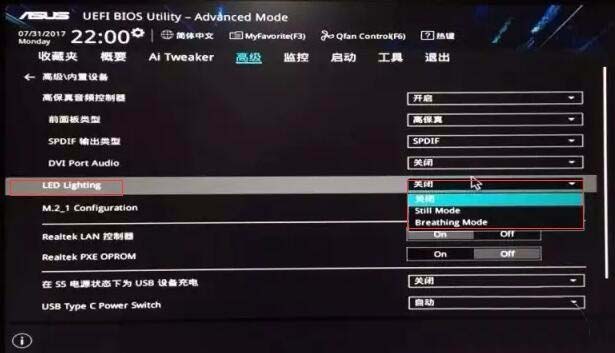 5)選擇“LED Lighting” 【右邊有幾個模式,分別為關閉,常亮,呼吸】