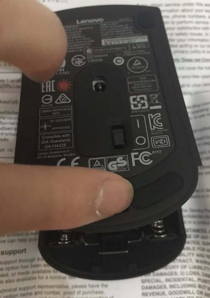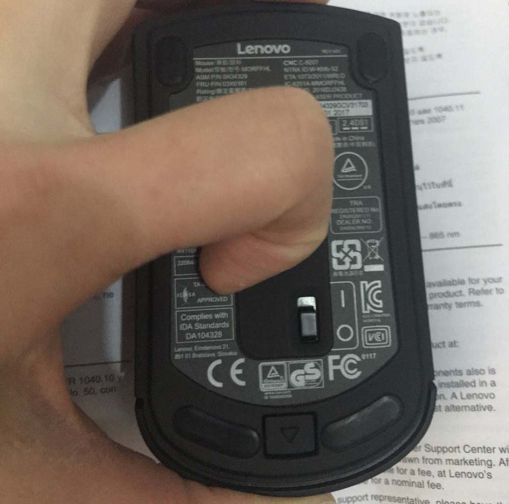 5、應該用手按我手指著的那個黑色的小三角,稍微使點勁兒按壓,鼠標就被打開了。