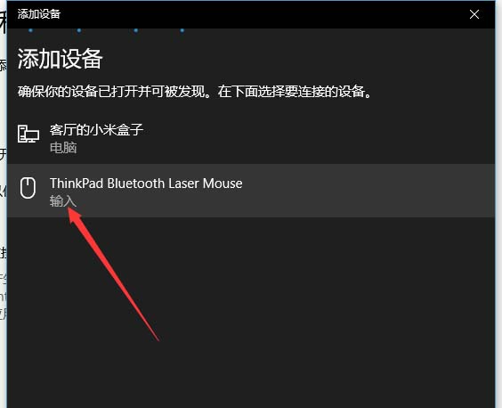 7、在彈出的界面中提示正在搜索設備,之后列出搜到的藍牙設備,在其中點擊,你要連接的藍牙鼠標 我的是thinkpad bluetooth laser mouse