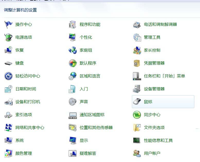 3、進入控制面板,里面有很多管理設置,從中找到鼠標兩個字或鼠標形狀的圖標,就可以打開鼠標設置對話框,可以對鼠標的參數進行設置