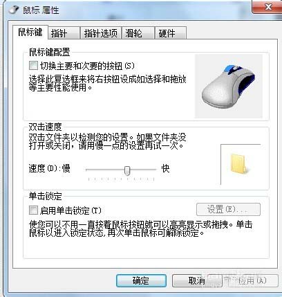 4、進入鼠標屬性,即鼠標設置面板,點擊鼠標鍵,在下面第二個設置里雙擊速度,用鼠標左鍵拖動塊,往左鼠標雙擊速度越慢,往右鼠標雙擊速度越快,可以點擊文件夾,調試到最佳