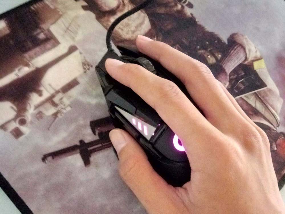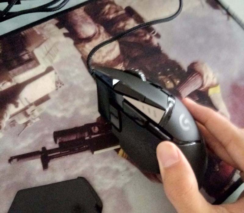 2、G502為每一根手指都提供了舒適的位置,右側的皺紋材質對于無名指來說很舒服,后方則是磨砂材質的,出汗也不怕。