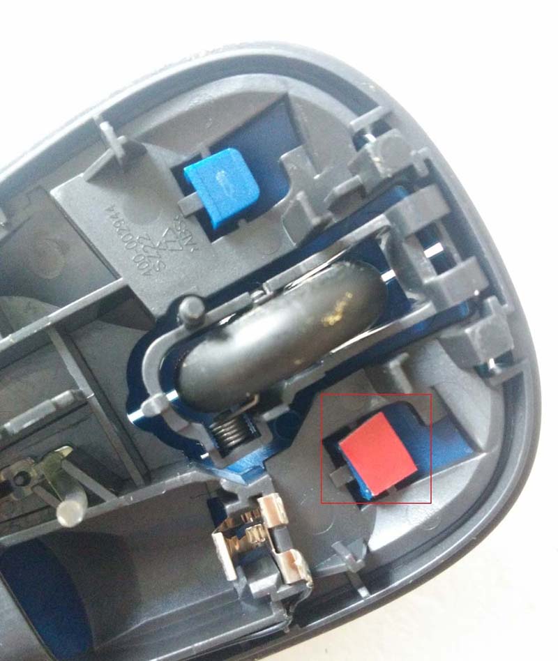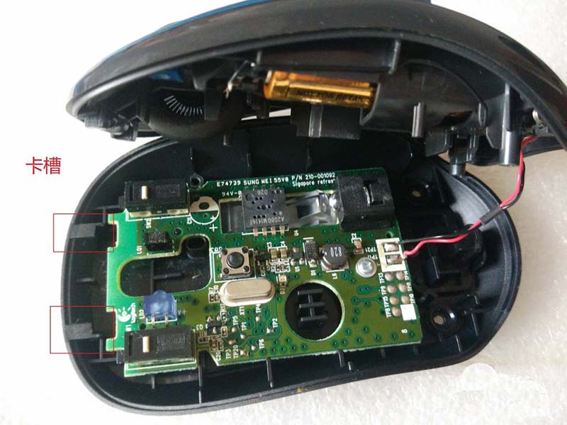4、抽出時不要用力過猛,以免將電池鏈接線抽斷,然后我們小心將蓋放置到旁邊,用手點擊左鍵的微動開關,看是否靈敏,接下來就要我們將電池安裝上去,對微動開關進行點擊測試,還好,我的開關在手動直接操控開關是反應靈敏的,這就說明我的按鍵是使用過程中沒有按壓到位,有了方向我們就要找解決的辦法。