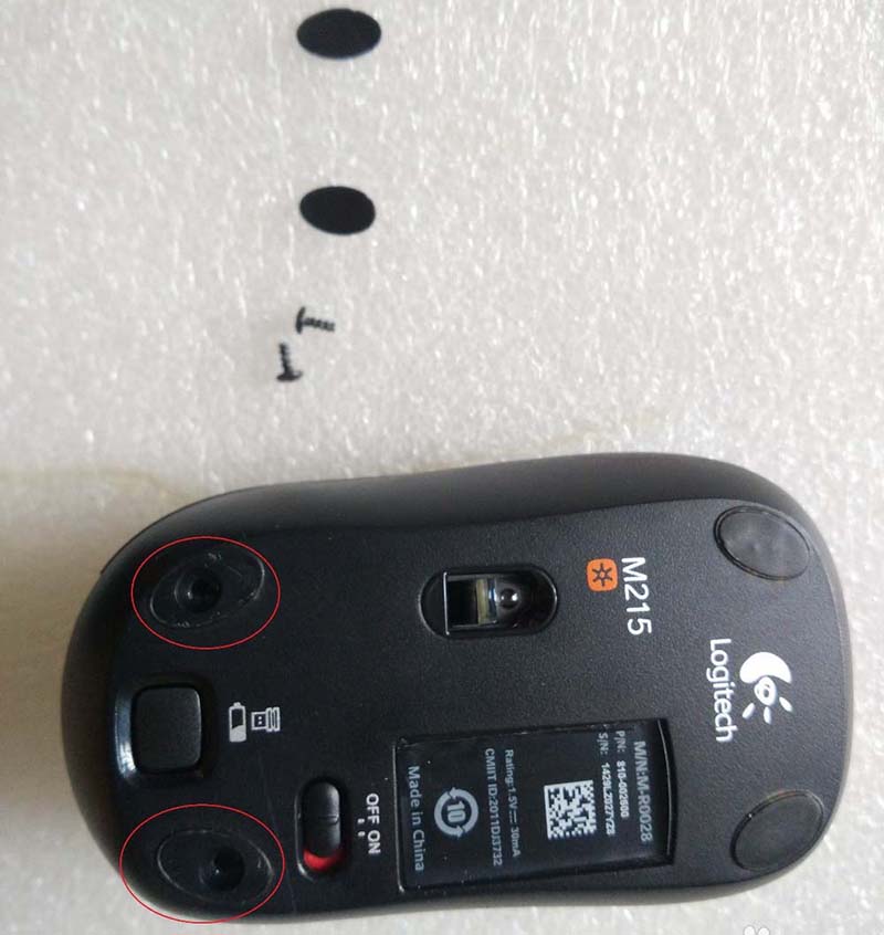 2、其次,我們將羅技鼠標進行拆卸,螺絲在下方的兩個踮腳處,我覺得這是設計的缺點,如果拆掉了上面覆蓋的防滑墊,就會翹起變形,導致后期使用不是很理想,所以我們在翹起螺絲上方的防滑墊的時候一定要小心。