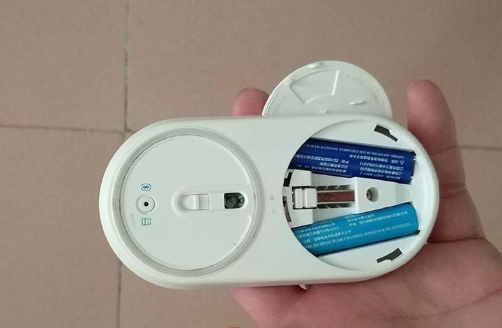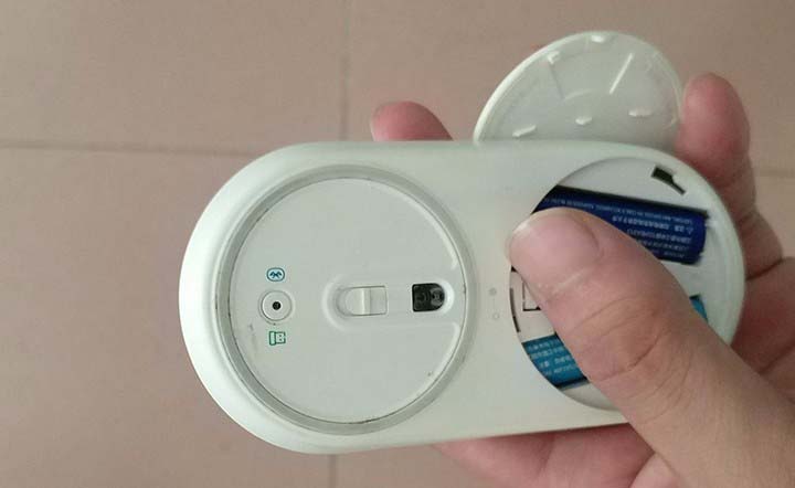4、小米鼠標(biāo)有一個(gè)切換轉(zhuǎn)換的按鈕,按下去綠光就是2.4g模式,藍(lán)光就是藍(lán)牙模式。采用兩節(jié)AAA電池供電,由于屬于非游戲鼠標(biāo)還是比較節(jié)電的。